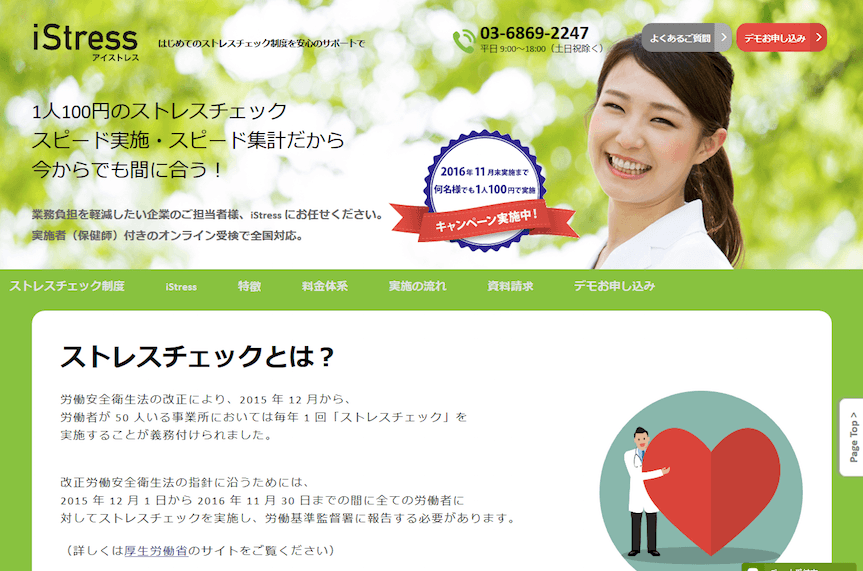 労働安全衛生法の改正により、2015 年 12 月から労働者が 50 人いる事業所においては毎年 1 回「ストレスチェック」を 実施することが義務付けられました。これは厚生労働省が推進している新しい制度で、多くの企業が対応を迫られています。弊社では保健師・看護師の人材を活用して、法人向けにストレスチェックサービス「i-Stress」を提供することにしました。